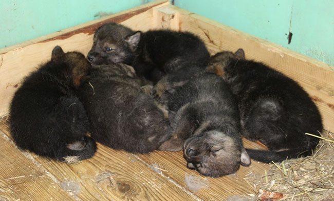 В марте трое детёнышей родились в семействе черно-бурых лисиц. Через пару недель дочка и сыночек родились у енотов-полоскунов. А в середине апреля сразу на пять детенышей пополнилась семья европейских волков.