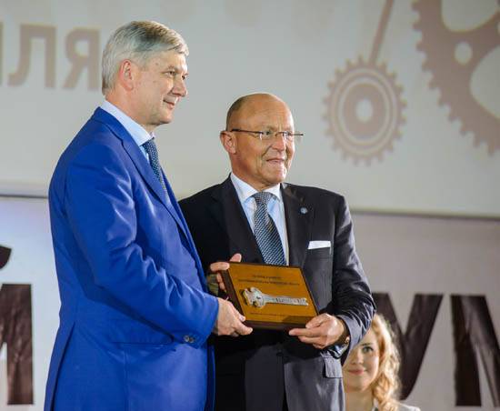 Предпринимательского форума – копию фирменного гаечного ключа с завода Вильгельма Столля – председателю правления Европейского акционерного общества «Бионорика СЕ» профессору Михаэлю Андреасу Карлу Поппу, с которым регион связывают крепкие и эффективные деловые отношения.