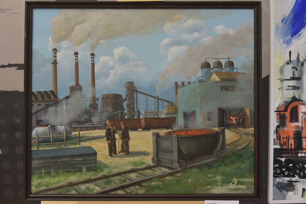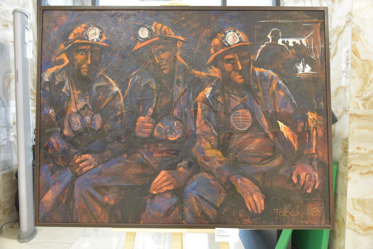 Вот покрытые угольной пылью лица шахтёров — работа художницы Юлии Трошкиной «Силуэты Донбасса». Тройной портрет передаёт сильные мужские характеры, закалённые суровой подземной работой по добыче уголька. А вот пышущий жаром металлургический комбинат — полотно Юрия Данилова «Металлургия Донбасса». У мощного производства своя, пусть не такая деликатная, но понятная красота. И почти в каждой работе донецких художников соединены крупные промышленные объекты и люди, для которых заводы, фабрики, шахты - часть их жизни, а, значит, и продолжение их самих.