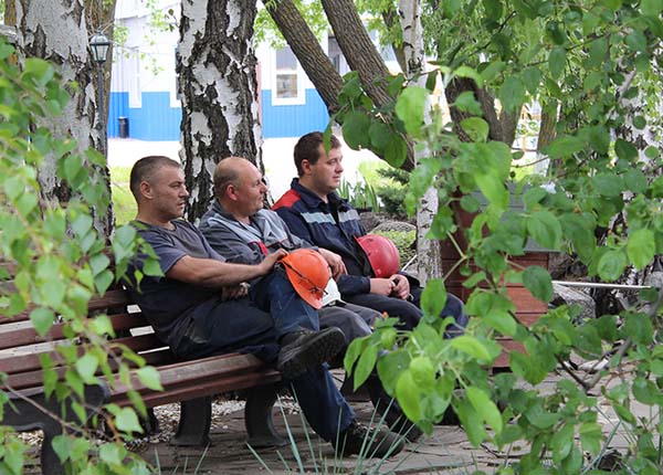 Рабочие в зоне отдыха, разбитой между цехами на заводской территории.