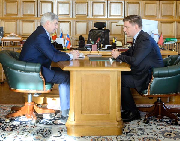 Александр Гусев и Сергей Сахненко обсудили вопросы перспективного взаимодействия Госкорпорации Ростех с Воронежской областью. Губернатор отметил заинтересованность региона в укреплении отношений с Ростехом.