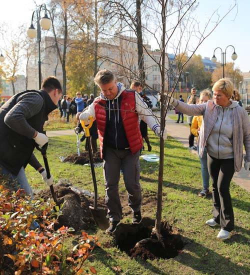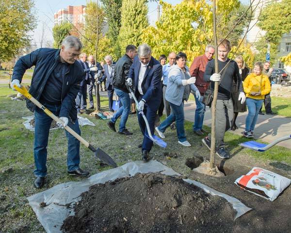 Александр Гусев вместе с ветеранами комсомола высадил деревья на центральной аллее сквера.