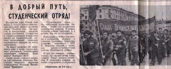 – Участвуя во всесоюзном походе – соревновании «За комсомольский знак качества», комсомольцы района осуществляли шефство над выпуском 11 видов продукции, 2200 членов ВЛКСМ работают по паспорту «комсомольская гарантия», 350-с личным клеймом качества.