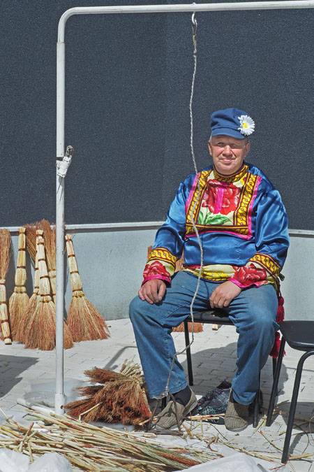 Тут же, рядом с «Царством шерсти», расположилось другое царство – веничное. Тракторист из Семеново-Александровки Николай Чувенков сидел на стуле, а вокруг него на мешковине лежали кучки веничного проса. Он то и дело брал длинные стебли, где надо подрезал и как-то так ловко, в одно мгновение соединял их. То и дело подходили телевизионщики, снимали, расспрашивали, что да как и вообще, чем правильный веник отличается от неправильного? Николай со знанием дела неспешно отвечал: