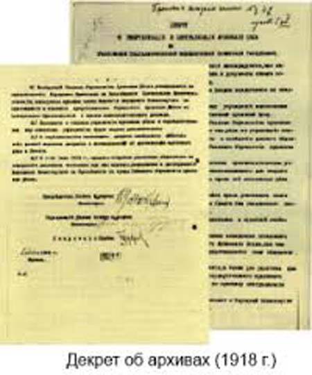 Первого июня 1918 года Владимир Ильич Ленин подписал Декрет «О реорганизации и централизации архивного дела», который положил законодательную основу всему архивному строительству. Согласно декрету «все архивы правительственных учреждений, как ведомственные архивы, были ликвидированы, и хранящиеся в них дела и документы составили единый Государственный архивный фонд. В целях лучшего научного использования, а также для удобства хранения и экономии расходов, отдельные части Государственного архивного фонда по возможности должны быть соединены по принципу централизации архивного дела».