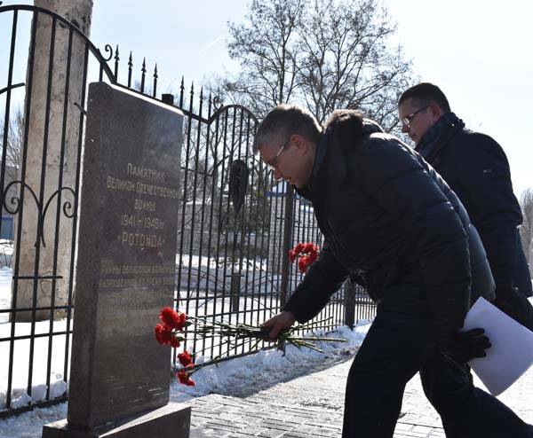 После осмотра Ротонды Евгений Ревенко, Александр Гусев и Владислав Кононов возложили цветы к монументу.
