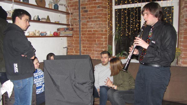 Открываю дверь – и погружаюсь во мрак. Лишь держа за руку организатора выставки, более-менее ориентируюсь в пространстве. Двигаясь против часовой стрелки вслед за другими посетителями, перехожу от одной композицию к другой. Гладкая невидимая мне фигурка из глины даёт рукам приятную прохладу – котёнок, это метроном (отчётливо прощупывается левитановский маятник), а вот что это – не соображу. Какие-то палочки да мелкие детали…