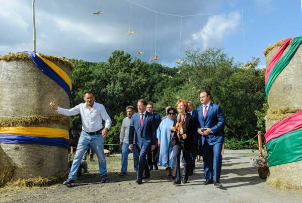 Первое, что осмотрели гости, – это интерактивная зона «Сено-Солома», автором которой является создатель Ломовского ландшафтного парка в Воробьевском районе Василий Козлов. В этом году она расположилась огромным блоком на Пионерской горке парка в виде «духовного лабиринта». Проходя по нему, попадаешь в стилизованные музыкальные и литературные сады по мотивам произведений Шолохова, Пушкина, Шукшина, Чехова, Рахманинова, Ростроповича. Один из садов посвящен истории нашего края – здесь стоит крестьянская изба с подворьем, а герои одеты в старинные костюмы Воронежской губернии.
