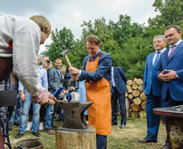 Губернатор также зашел в кузницу и поучаствовал в процессе создания металлического символа Года экологии, который станет украшением фестивальной площадки.