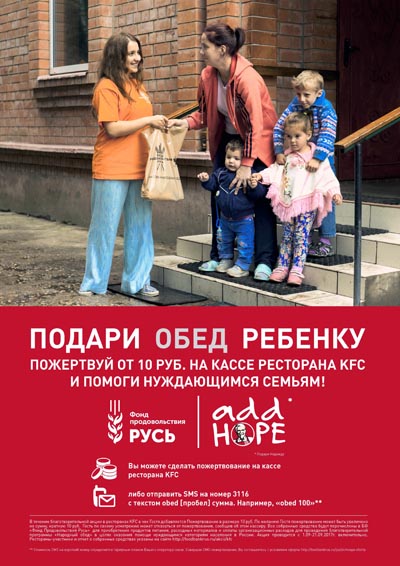 В период с 1 по 21 сентября включительно гости 550 ресторанов KFC в 100 городах России смогут сделать пожертвование от десяти рублей при оплате своего заказа на кассе. На собранные средства «Фонд продовольствия «Русь» закупит макароны, гречку, рис, овсяный «Геркулес», горох, подсолнечное масло.