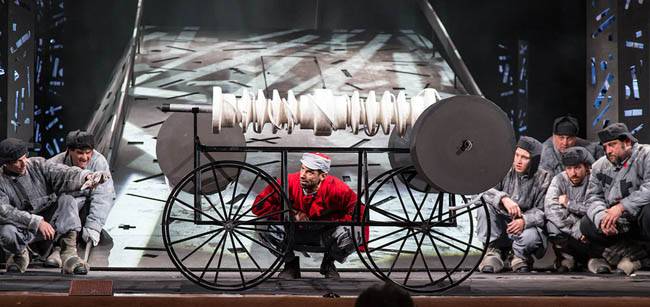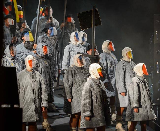 Создателей сегодняшнего спектакля от того стиля и теперь уже далекой эпохи отделяет почти вековая дистанция. И авангард обрушивается на зрителей уже в преломленном временем виде. На события и их стилевые контексты предлагается взглянуть со стороны, и для этого упрощенные плакатные формы погружены в сложный современный язык сценографии и мизансцен – мастерски решены массовые сцены, сценическое действие переполнено движением. Дирижер тоже четко следуют стилевому фарватеру, который был задан композитором – оркестр оказался на высоте заданной планки. Большая работа проделана хором.