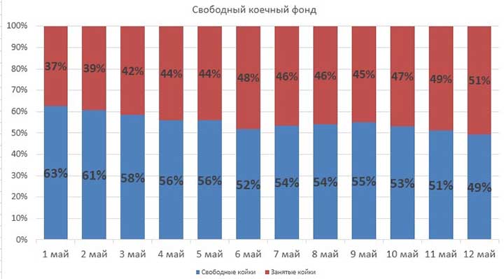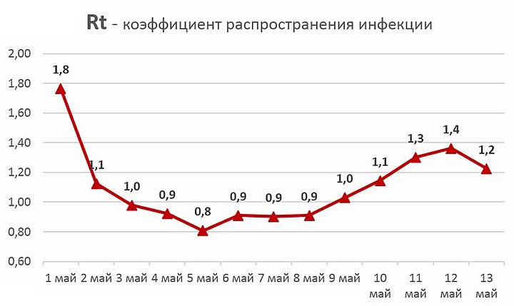 Первый — RT — коэффициент распространения инфекции. Для полноценного перехода к первому этапу снятия ограничений он должен быть не более 1. По сути, это отношение общего числа заболевших за последние 4 дня к общему числу заболевших за 4 дня, предшествующие этим. На 13 мая этот коэффициент, увы, равен 1,2.