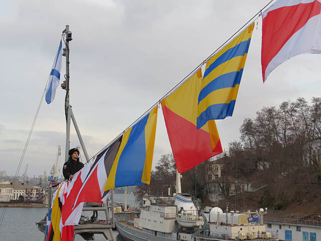 Утром следующего дня, 24 декабря, гости из Лисок были приглашены для участия в торжественном поднятии флага на верхнюю палубу корабля, где выстроились экипаж БДК, ветераны службы на этом корабле, почётные гости. Под звуки российского гимна на кормовом флагштоке реет Андреевский флаг, а Севастопольскую бухту торжественно озаряют флаги расцвечивания, взметнувшиеся над корабельными надстройками.