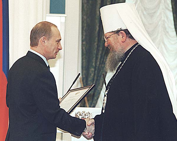 Президент РФ Владимир Путин вручает митрополиту Сергию