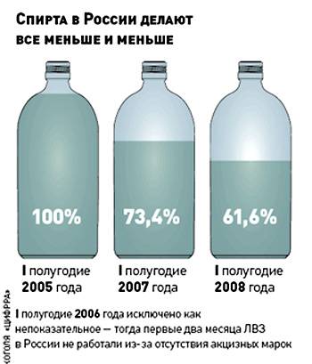 Оказывается, в России официально выпускается гораздо больше водки, вина, коньяка и других алкогольных напитков, чем существует спирта. Условно говоря, внутри страны производится один литр 70-градусного спирта, ещё один – импортируется. По логике, на ликёро-водочном заводе (ЛВЗ) из этих двух литров могут сделать 3,5 литра 40-градусной водки. Но наши умельцы умудряются прыгнуть выше головы. Они делают аж пять литров водки, причём нормальной крепости, да ещё и акцизные марки на неё совершенно официально умудряются наклеить. Просто алхимия какая-то!
