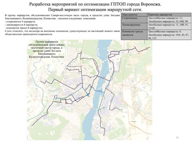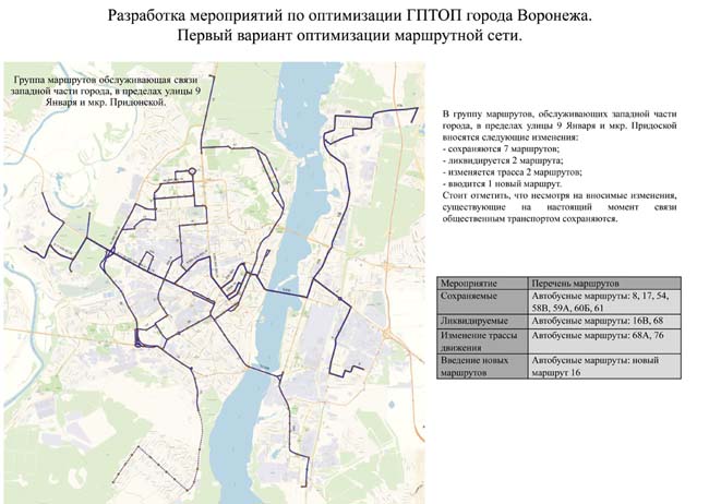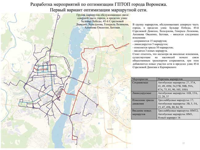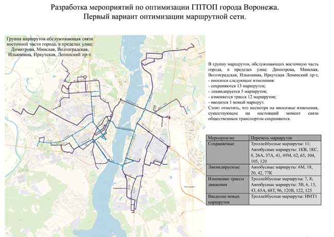 Открытую презентацию проекта провели представители разработчика – ФАУ «РосдорНИИ». Владимир Пащенко и Дмитрий Порошин озвучили данные анализа нынешней маршрутной сети Воронежа и предложения по изменению ситуации. Основные недостатки действующей сети –перенасыщенность (дублирование маршрутов достигает 50%), отсутствие выделенных полос для движения пассажирского транспорта, большое количество подвижного состава малой вместительности, изъяны в транспортном обслуживании новых микрорайонов.