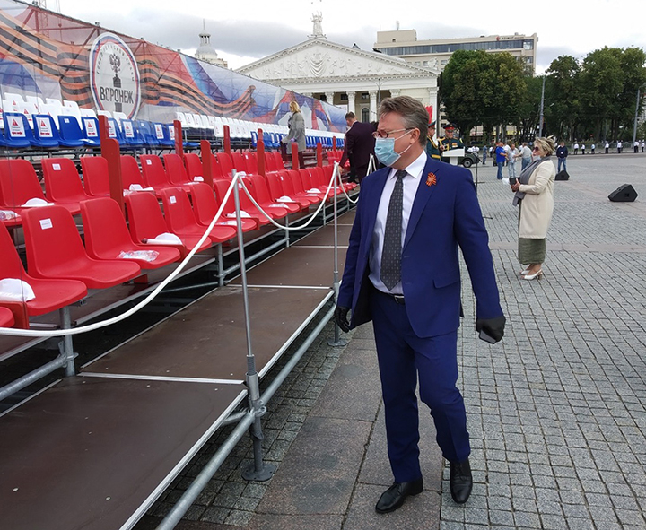 Трибуну к приёму ветеранов подготовили: продезинфицировали, нанесли наклейки, на сидения разложили пакеты с маской, перчатками, санитайзером и водой, – убедился мэр Воронежа Вадим Кстенин. Фото и видео: voronezh-city.ru