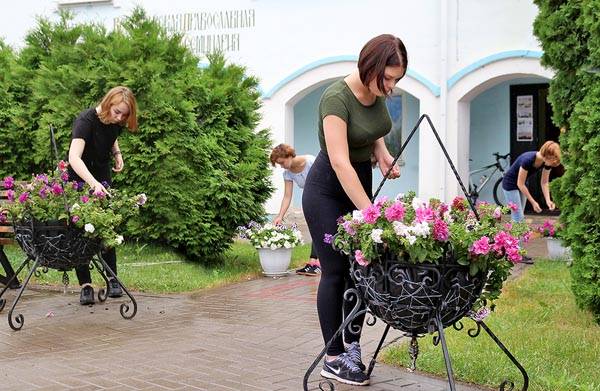 Подростки ухаживают за цветами и садом Успенского