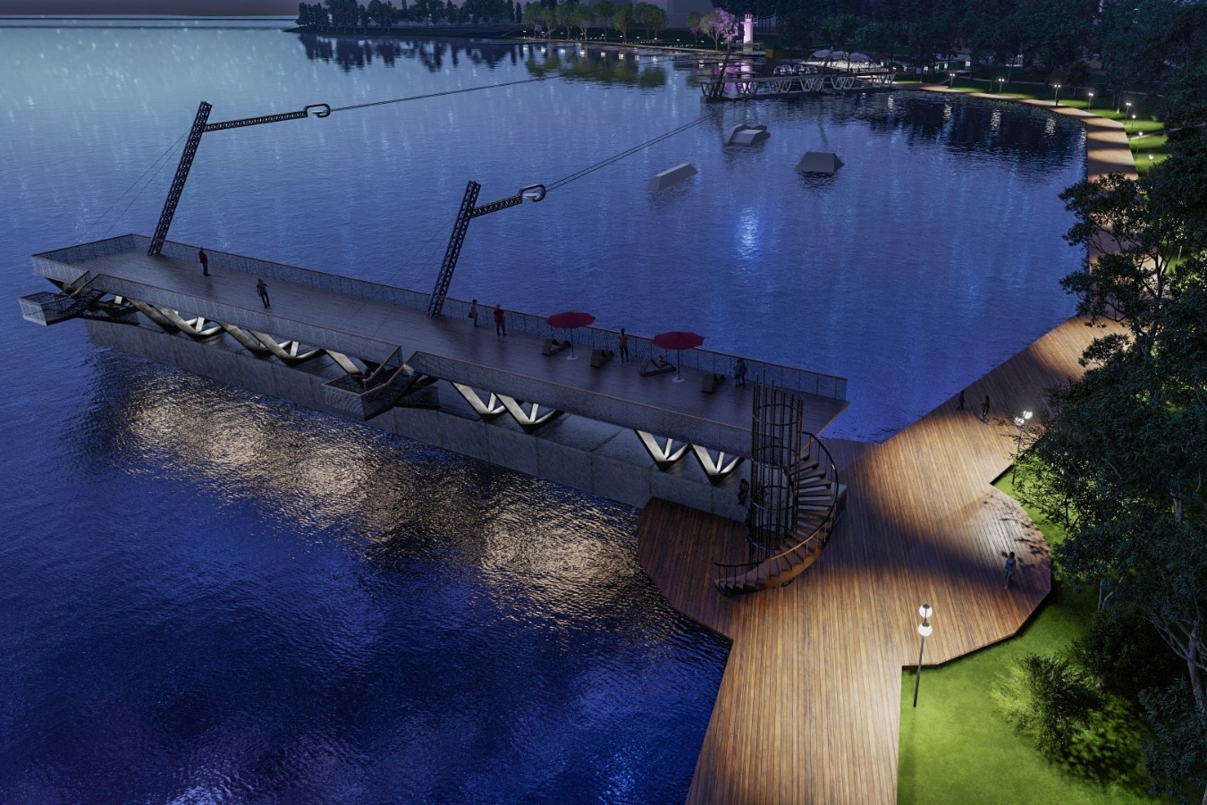 В соответствии с проектом и концессионным предложением в течение ближайших четырёх лет на Спортивной набережной могут появиться деревянный пирс, «трасса здоровья» для велопрогулок и пробежек, барбекю-зона для безопасных пикников на природе, беседки «гнёзда», площадки для игр, выгула собак, система бассейнов, вейк-парк, ресторан и глэмпинг на воде. Общая территория планируемого благоустройства составит более 83 тысяч квадратных метров, а сумма инвестиций – около 200 млн рублей.