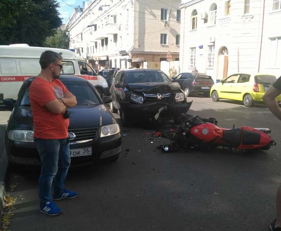 Свидетели ДТП сообщили в городской группе «Типичный Воронеж» соцсети «ВКонтакте»: «Мотоциклист ехав через перекресток на зеленый решил сделать трюк, вроде "Вилли", при ударе о землю его подбросило и он вылетел на встречку, после чего был громкий удар» , «водитель мото… просто перелетел и упал более менее, на ноги и лишь потом на спину», «хорошо, что был в шлеме и в мотоциклетном костюме..»