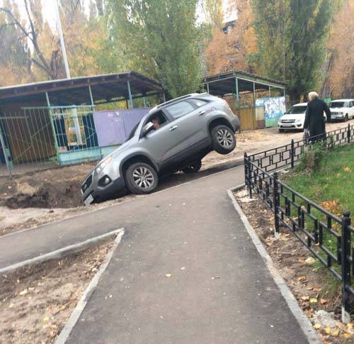 Воронеж, улица 25 Января. Суббота, 21октября. На участке, где ведется ремонт теплотрассы, в не обозначенную ограждением яму угодило колесо автомобиля. Никто не пострадал. Водителю и пассажирам кроссовера пришлось «прыгать», чтобы привести автомобиль в нормальное положение.