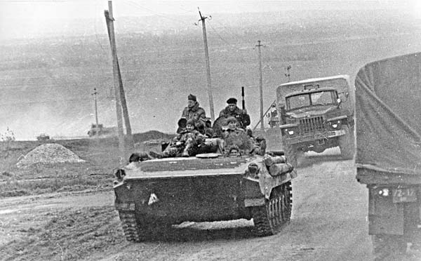 …Взорванный мост на въезде в Грозный пока еще не восстановлен, дорога идет в объезд. Когда мы возвращались, над перевалом, как и утром, висел туман. Город не просматривался. Лишь в некоторых местах проступало зарево: горит газ на поврежденных участках газопровода. Из города с нами уходили тягачи«ураганы», вывозившие подбитую технику. На некоторых участках дороги они садились на брюхо. Мы несколько раз останавливались, пропуская встречные воинские колонны. Одну остановку сделали у подбитого танка, ржавеющего здесь, говорят, еще со времени ноябрьского штурма. А неподалеку обломки сгоревшего в январе вместе с экипажем вертолета.
