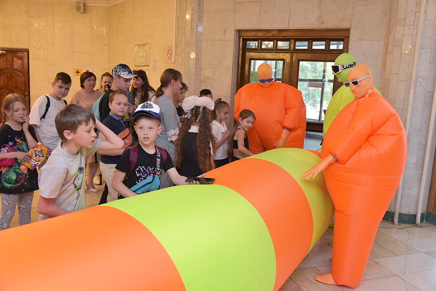 У площади Победы выступали артисты кукольного театра и цирковые коллективы. У памятника Биму развернули научную интерактивную площадку, где мальчишки и девчонки под присмотром взрослых проводили химические эксперименты, участвовали в квизах и викторинах.