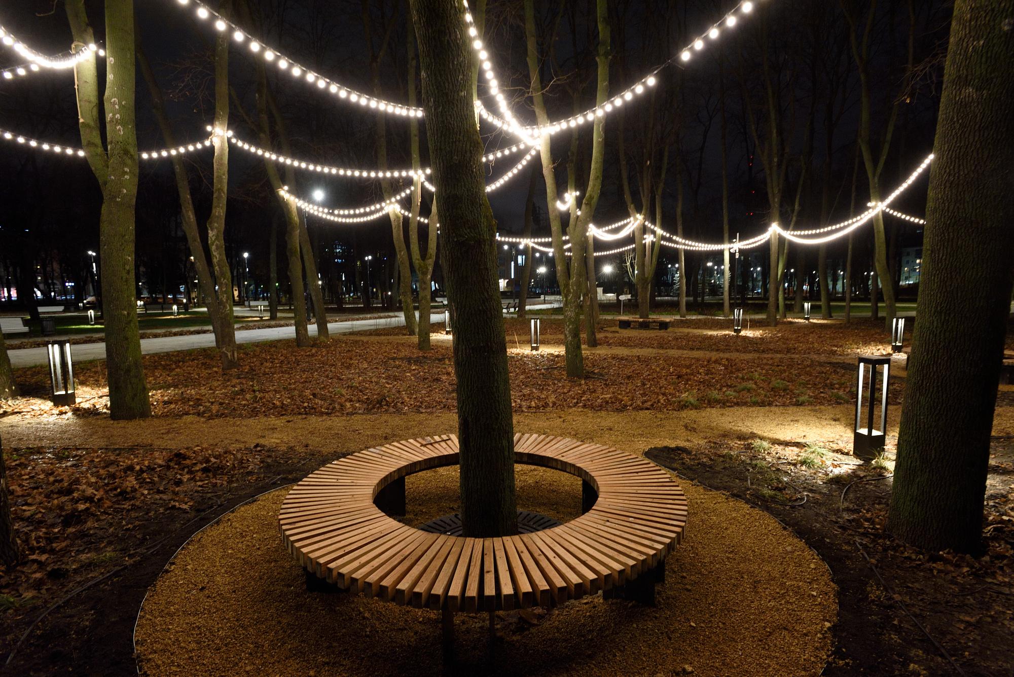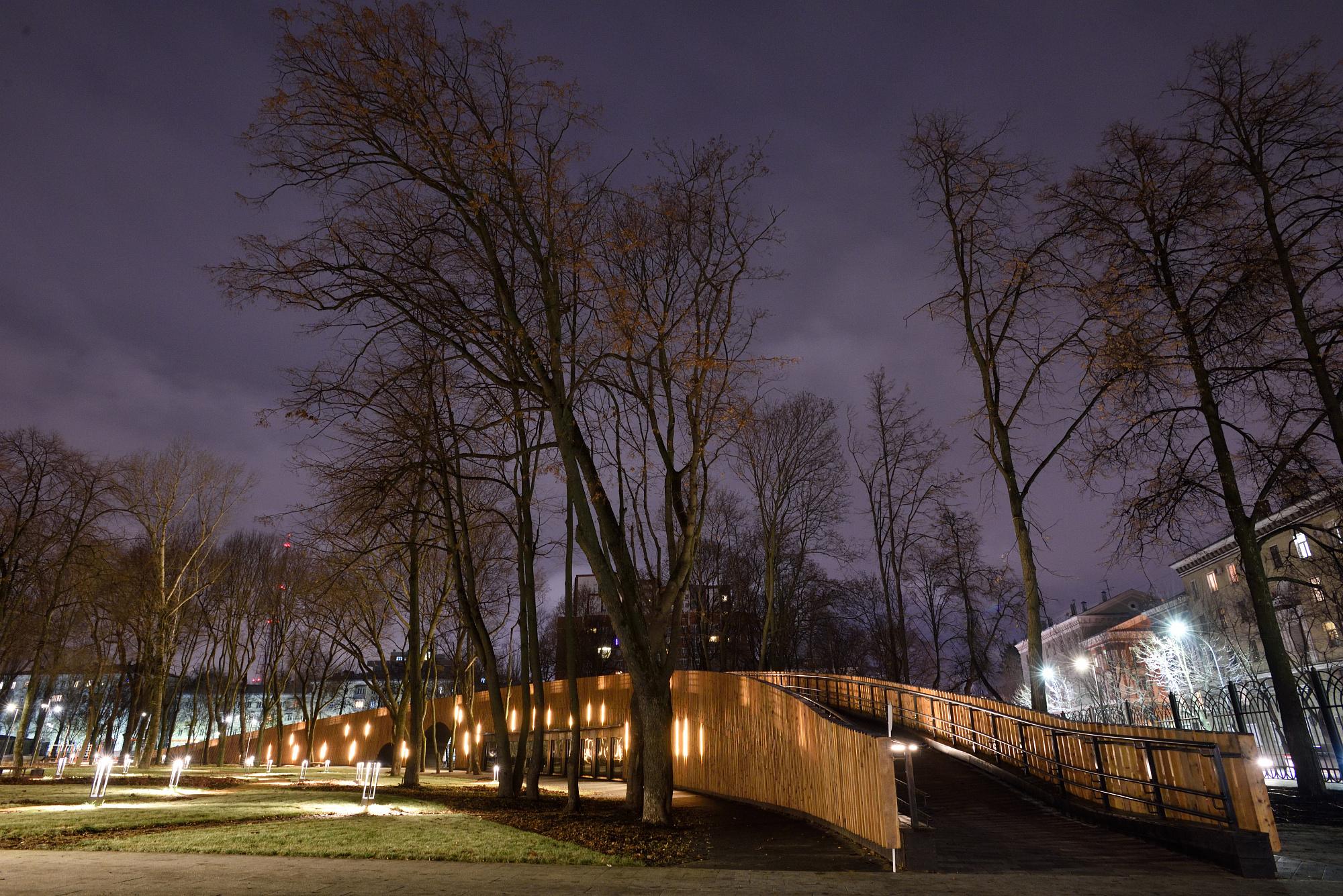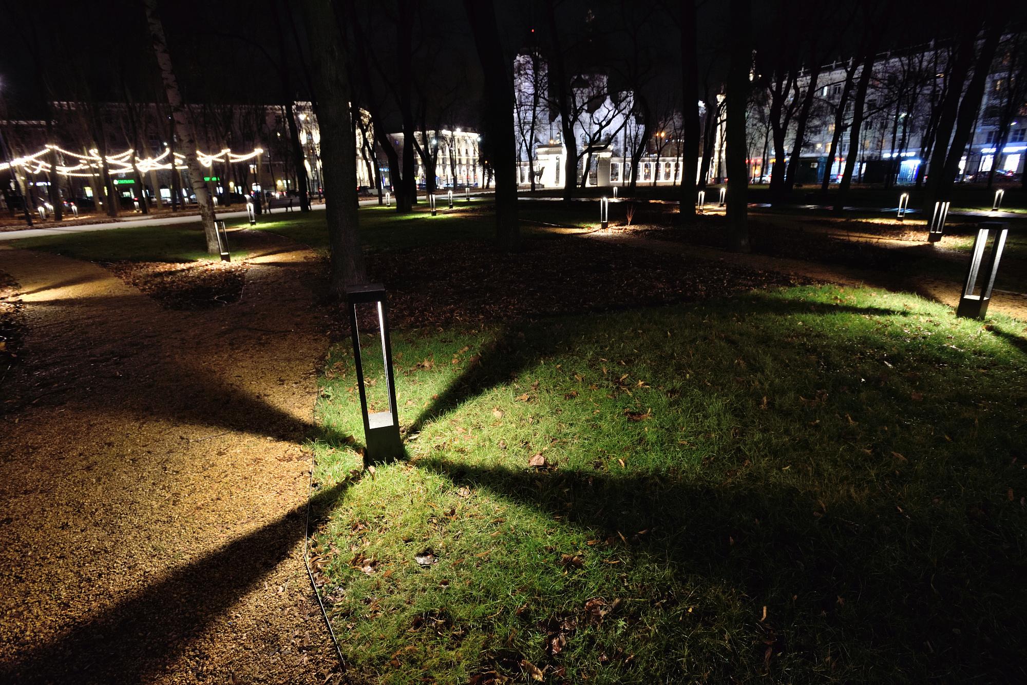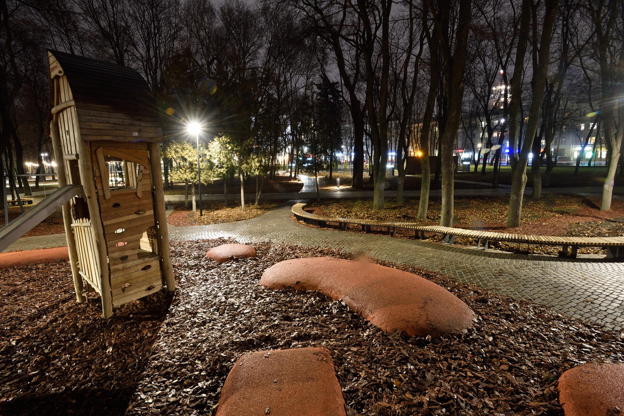 Новый «Орлёнок» прекрасно подходит для вечерних прогулок: там стало больше света. Классические фонари оставили на прежних местах. К ним добавили небольшие ландшафтные светильники, вмонтированные вдоль тропинок. А на некоторых деревьях развесили гирлянды со светодиодами тёплого жёлтого света.