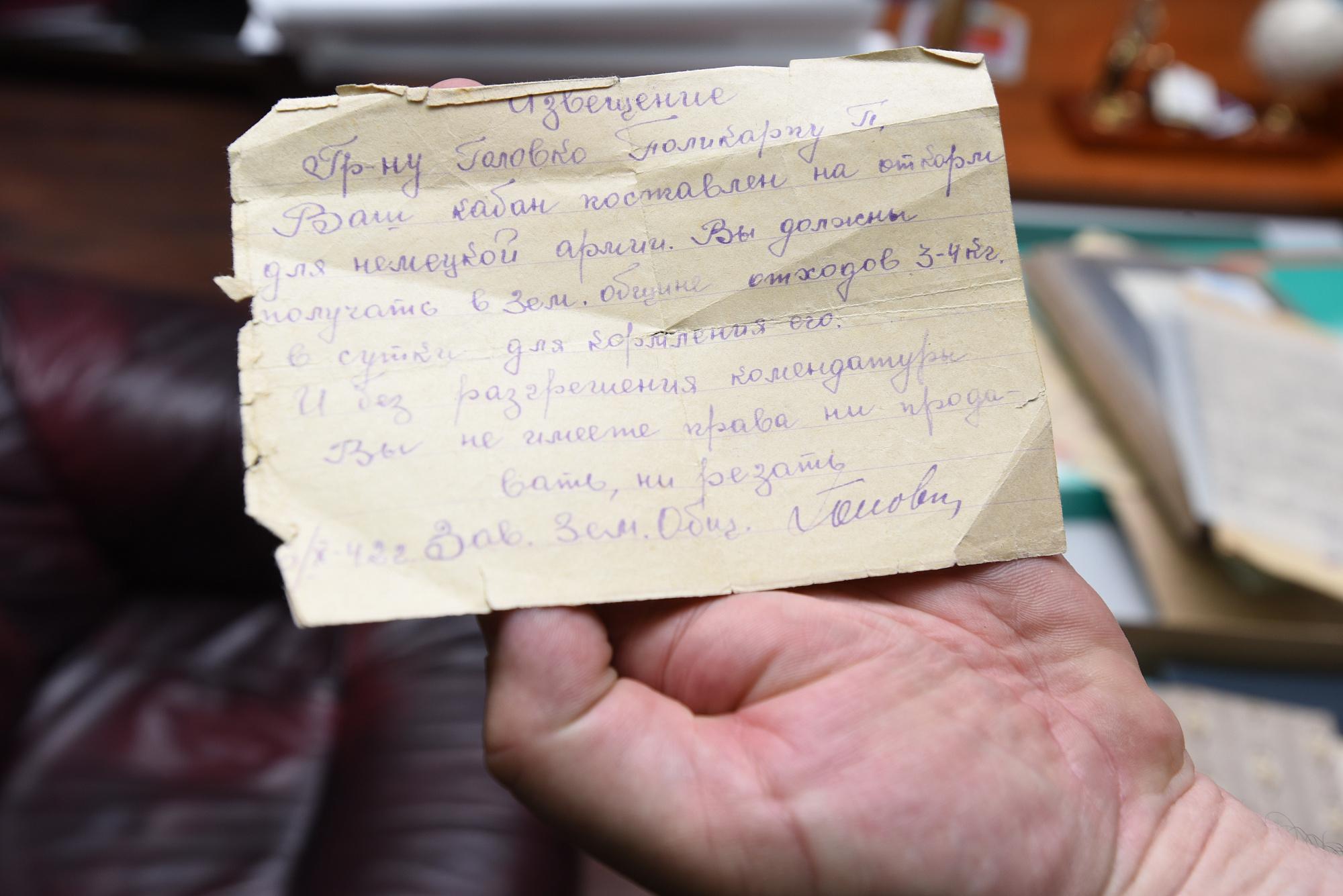 В отдельном зале – мебель зажиточных крестьян из Павловска, Калача, Бутурлиновки. Есть и архивные документы: например, метрическая книга Россошанской церкви 1861 года и рукописный призыв к контрреволюционной деятельности. Любопытно извещение, выданное в октябре 1942 года некому Поликарпу Головко. Мужчине сообщают, что его кабан поставлен на откорм для нужд немецкой армии. И теперь хозяин кабана не имеет права его ни продавать, ни резать.