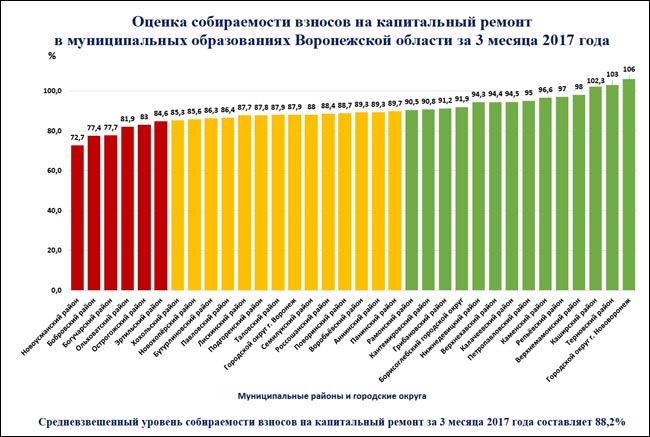 [DETAIL_TEXT] => За три истекших месяца 2017 года собираемость взносов на капитальный ремонт помещений в жилых многоквартирных домах в Воронежской области составила 88,2% от начисленных сумм, что на 3,2% превышает среднероссийский показатель.