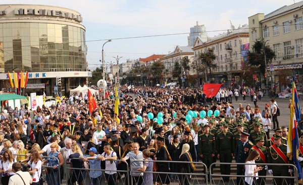 Настал миг, когда дирижёр сводного оркестра Воронежской филармонии подал знак, и грянул марш. В числе первых оказались колонны факультета военного образования и географии, геоэкологии и туризма, журфака. Возглавлял шествие ректор вуза Дмитрий Ендовицкий, периодически провозглашая: