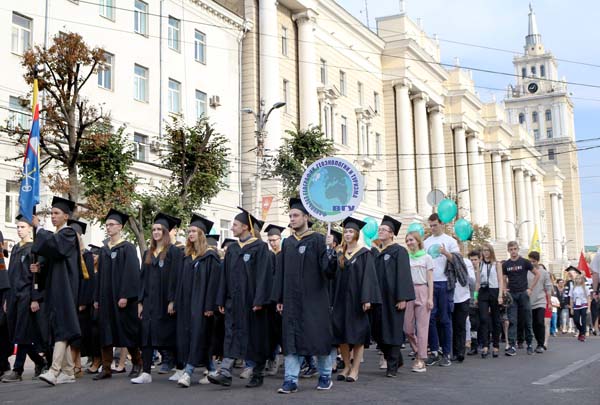 Многие воронежцы ещё только готовились к празднику, а на проспекте Революции, возле здания Управления ЮВЖД, уже начали собираться участники торжественного парада студентов, выпускников, сотрудников и партнёров ВГУ. На многих были футболки с символикой вуза и его факультетов или академическая одежда – мантии и конфедератки. На парад пришли представители воронежских вузов, когда-то отпочковавшихся от ВГУ – медицинской академии и педагогического университета.
