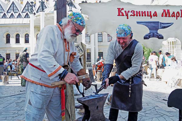 Особенно шумно (от звуков молотов, бьющих по наковальне) и жарко (от пылающих углей) в этот день было на площади возле кукольного театра, где проходил фестиваль кузнецов. На него собрались участники из Воронежа и области, а также Москвы, Рязани и Белгорода. По словам трех друзей из Нововоронежа, Константина Антонова , Александра Чалого и Максима Кузьменко, они уже пять лет занимаются ковкой, для них это хобби. Пока в основном делают бытовые предметы – ножи, топоры, но надеются в будущем достичь того же уровня искусства, какое представили гости фестиваля из столицы. В том, что современные последователи Левши могут, если и не блоху подковать, то выковать симпатичного муравья, сказочную карету, запряжённую мышами, удивительные букеты из нежных роз и как будто бы действительно шумящий на ветру камыш, убеждала выставка кованых изделий, расположившаяся тут же.