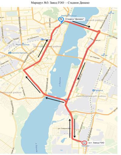 – №№ 3, 5, 20м, 25а, 27к, 50, 70а, 70м, 88, 88а – с площади Ленина по улицам Плехановской, Фридриха Энгельса, Кольцовской, проспекту Революции, далее по маршрутам; в обратном направлении – с проспекта Революции по улицам Феоктистова, Фридриха Энгельса, Комиссаржевской, Никитинской, Средне-Московской, Пушкинской, Плехановской, площади Ленина, далее по маршрутам;