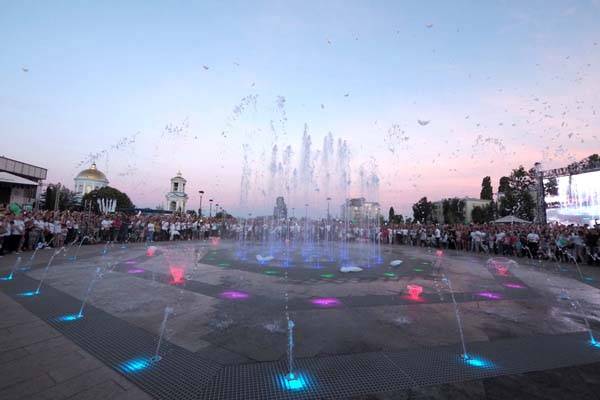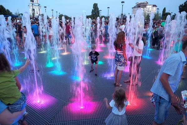«сухих» фонтана – первых в Воронеже. Между струями воды этих фонтанов можно побродить, оставаясь при этом сухим. Водная чаша расположена ниже уровня земли, а форсунки вмонтированы в мощение. Вода бьет прямо из-под земли, а струи меняют цвета в такт музыке. В темное время суток работают вмонтированные вокруг фонтана в плитку светильники. Зимой здесь будет залит каток.
