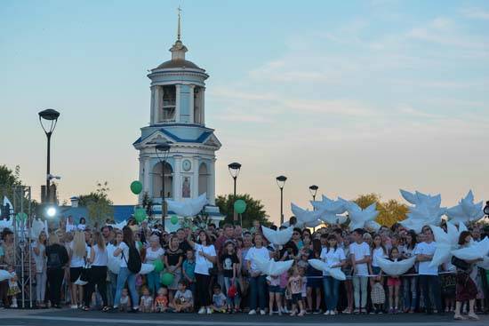 После официальной части собравшиеся на Советской площади более трёх тысяч воронежцев вместе с ведущим праздничного вечера начали обратный отсчет: три, два, один! Под звуки фанфар в воздух взвились разноцветные струи воды. В небо взлетели сотни воздушных шаров в виде белоснежных птиц.
