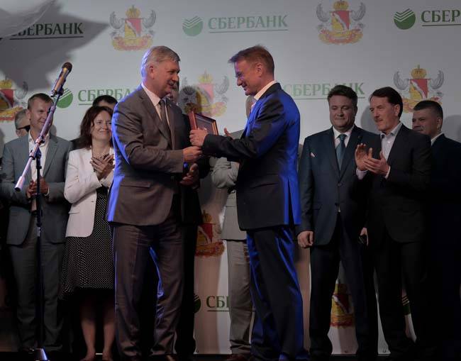 В завершение своего выступления Александр Гусев вручил Герману Грефу почетный знак «Благодарность от земли Воронежской».