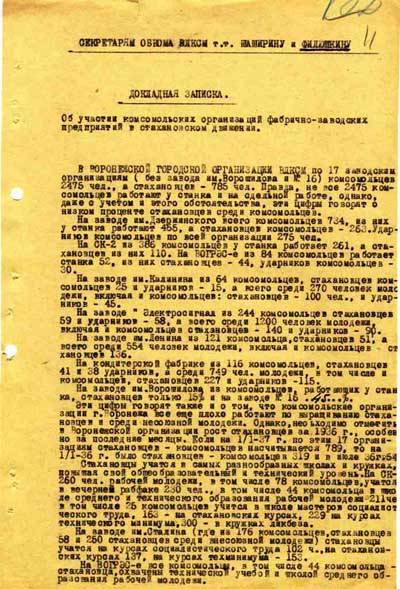 «…нужно руководить, изучать комсомольцев на производстве, проверять работу, являются ли комсомольцы организаторами, какова их роль в производстве, с тем, чтобы комсомольцы были стахановцами, были передовиками, лучшими на производстве, чтобы на основе этого создать у нас движение в области, среди комсомольцев, среди несоюзной молодежи».