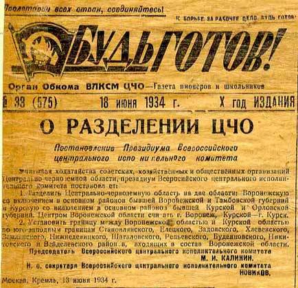 «…Сегодня революционная молодежь Советского Союза празднует 15-летний юбилей комсомола. 15-летний путь суровой школы большевистского воспитания молодого поколения под руководством нашей партии. На всех этапах социалистического строительства комсомол выступал, выступает и будет выступать, как боевая могучая многомиллионная организация рабочей, колхозной, и крестьянской молодежи. Комсомол ЦЧО один из крупных отрядов всесоюзного комсомола. Он вписал ни одну славную страницу в историю своей борьбы, в открытых боях за власть советов, за восстановления хозяйства. От нескольких кружков, насчитывающих десятки в своем составе революционной молодежи в 1917-м году к своему 15-ленему юбилею комсомол ЦЧО приходит сплоченной монолитной организацией, насчитывающей тысячи комсомольцев. Плюс к этому десятки тысяч молодых рабочих, колхозников, прошедших школу комсомола, приобщились к активному участию в социалистическом строительстве. Это наглядный рост, работы комсомола, возрастающего влияния на трудящуюся молодежь. Это показатель того, как комсомольская организация, сплоченная вокруг борьбы за партию достойна того, чтобы в любой момент и в любой обстановке выступить за защиту Октября….