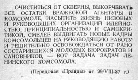 «Очиститься от скверны, выкорчевать все остатки вражеской агентуры в комсомоле, насытить жизнь низовых и руководящих организаций идейностью, принципиальностью и самокритикой, смелее выдвигать новые кадры комсомольцев на руководящую работу и решительно освобождаться от рано состарившихся молодых бюрократов и сановников. - вот задача задач Ленинского комсомола».