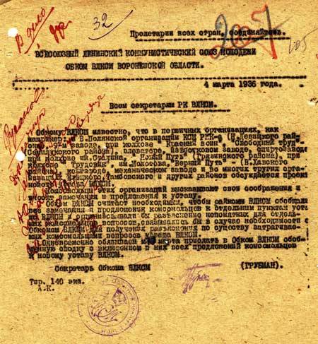 «В Воронежской области произошло резкое снижение численного состава комсомольской организации. После обмена комсомольских билетов ушло 32000 комсомольцев, т.е. из организации с количеством 141501 человек, осталось 101294. Несмотря на рост за последние годы, апрель 1932 г., январь 1935 г. в комсомол было принято 34846 человек. На 01 января 1935 г. областная организация насчитывает 82487 человек.