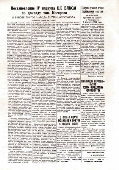 «За последнее время вскрыты факты вражеской, подрывной работы в комсомоле, свидетельствующие о том, что троцкистско-бухаринские шпионы, террористы, предатели социалистической родины продолжительное время орудовали в организациях ВЛКСМ.