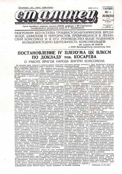 Из постановления IVпленума ЦК ВЛКСМ (21-28 августа 1937 года) по докладу тов. Косырева «О работе врагов народа внутри комсомола»