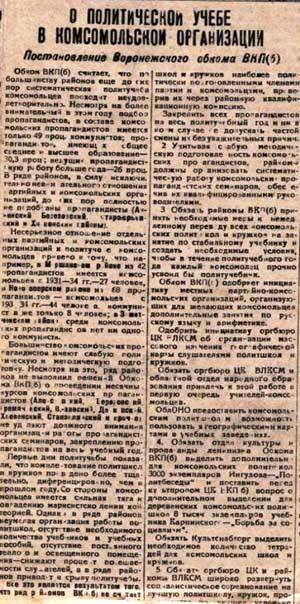 «Первая областная конференция ВЛКСМ признает политическую линию Оргбюро ЦК ВЛКСМ правильной, практическую деятельность удовлетворенной. Воронежская организация, выполняя все поставленные задачи пришла в своей конференции политически и организационно крепкой, сплоченной вокруг Всесоюзной коммунистической партии.