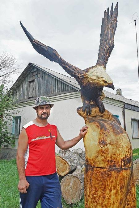 – Идеи рождаются от бревна, – говорит Денис Шушеров. – Смотрите, – рукой обрисовывает в воздухе бревно по контуру, – вот голова, там хвост, здесь отпилится – и получится летящий орёл. Картинками-шаблонами я не пользуюсь. Фигуры эксклюзивные. А когда просят, то на заказ получается уже не то, так как сужаются рамки фантазии.