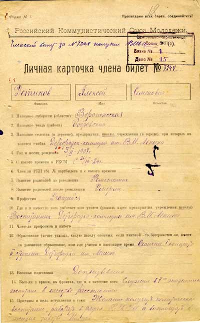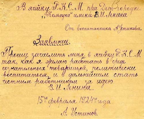 «...В траурные дни 1924 года, когда вся страна прощалась с нашим любимым вождем В.И.Лениным, многие молодые рабочие решили вступить в комсомол и активно продолжать дело начатое Лениным. В эти дни и я накрепко связал свою жизнь с комсомолом. Я стал еще активнее участвовать в общественной жизни. Деповские ветераны, коммунисты с дореволюционным стажем порекомендовали избрать меня председателем на общественных началах общества «Долой неграмотность» Лискинского упрофсожа.