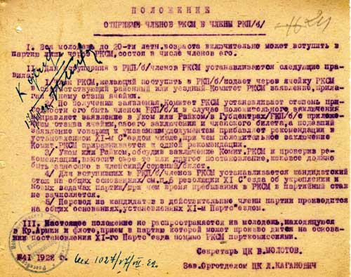 Для успешного проведения работы среди молодежи союз должен проводить ее совместно с РКСМ – единственной организацией рабочей молодежи. Поэтому профорган должны привлекать представителей РКСМ, обучать их своей работе, а более дельных вводить в состав рабочкомов и правлений. Следует также совместно с РКСМ проводить специальную широкую работу среди молодежи через ее беспартийные конференции…».