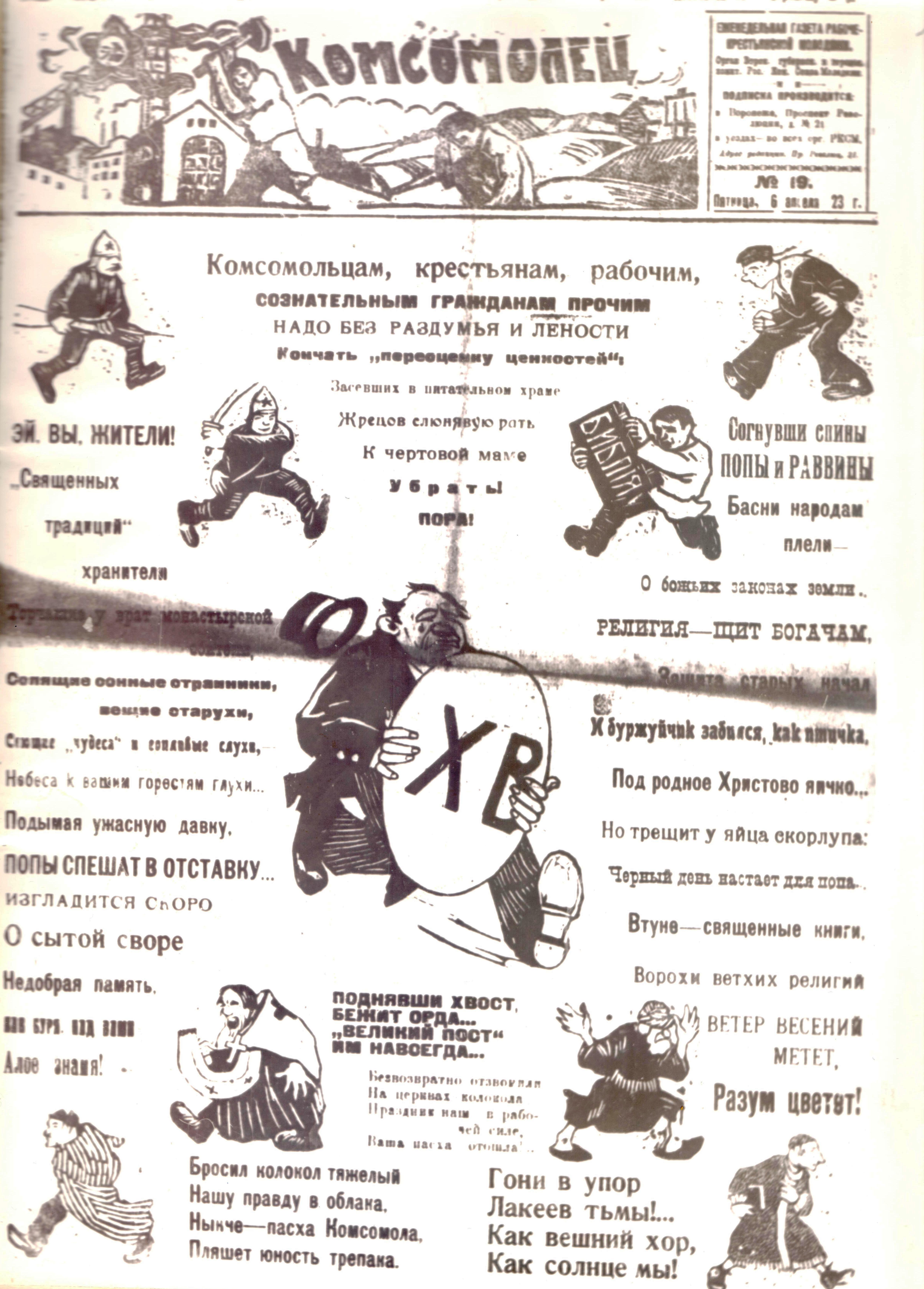 Вместо евангельской чуши мы должны преподнести молодежи слова, разоблачающие эту же чушь. Церковное «Христос Воскресе» мы заменим звонкой комсомольской частушкой. Небольшое комсомольское представление с успехом заменит представление церковное, и тогда молодежь, вместо того, чтобы плестись в церковь, побежит в наш клуб.