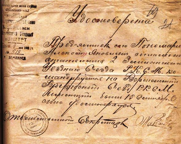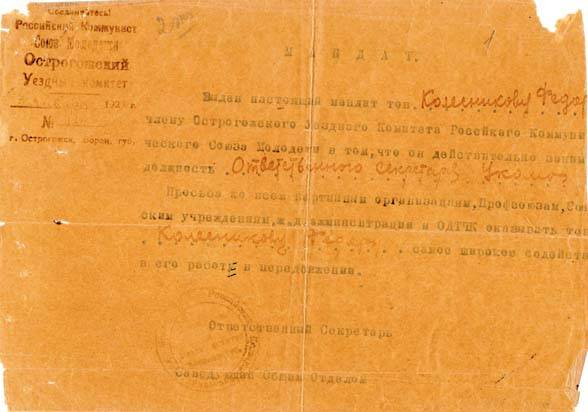 «В первой половине 1919 года на фронт Деникина союзом было выделено до 20 товарищей добровольцев, ушедших несмотря на запрещения своих родителей…При содействии т.т. Еремеева и Кардашова, было сразу по всем уездам отправлено 14 товарищей, прикомандированных к уездным уполномоченным по мобилизации десяток. Посланные товарищи, попутно с агитацией против казачества, занялись организацией в уездах союзов молодежи…В результате поездки по губернии имелось уже 15 новых организаций, объединяющих около 500 человек крестьянской молодежи.