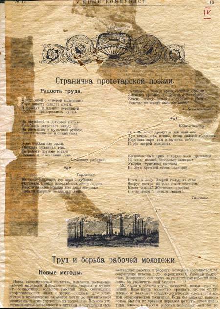 …В середине 1918 г. организовался Союз учащихся коммунистов (вошло в него до 30 человек). Члены союза учащихся имели средний культурный уровень, а потому заниматься тем, чем занимался союз рабочей молодежи не могли. Тут больше увлекались спорами о литературе, политике, многие стали изучать политическую экономию, читать Маркса…При поддержке союза учащихся осенью удалось организовать политический кружок и кружок по изучению политической экономии».